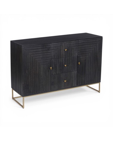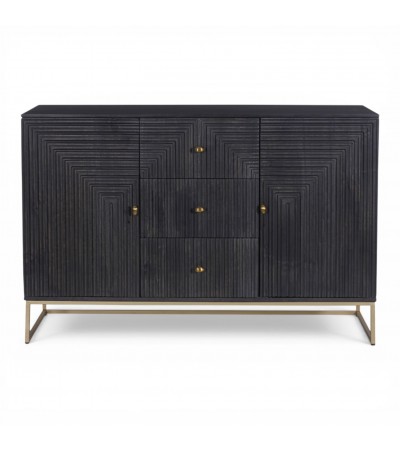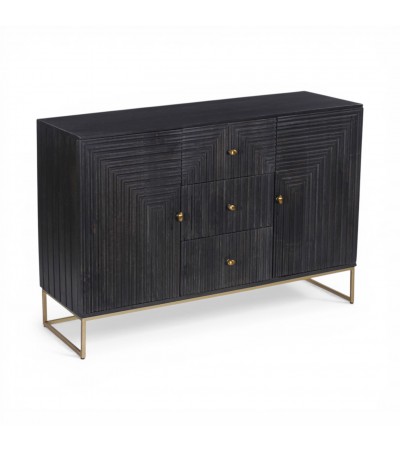 Die reliefartig geschnitzten Fronten mit geometrischen Linien erzeugen ein faszinierendes Spiel aus Tiefe und Licht und machen das Möbelstück zu einem echten Blickfang.