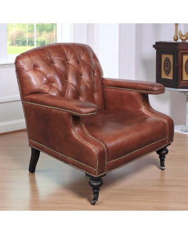 Gepolsterter und patinierter brauner Ledersessel, Chesterfield Stil "Ethan"