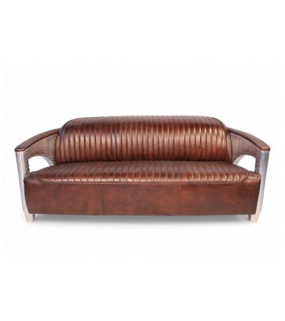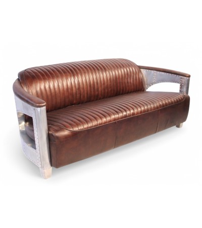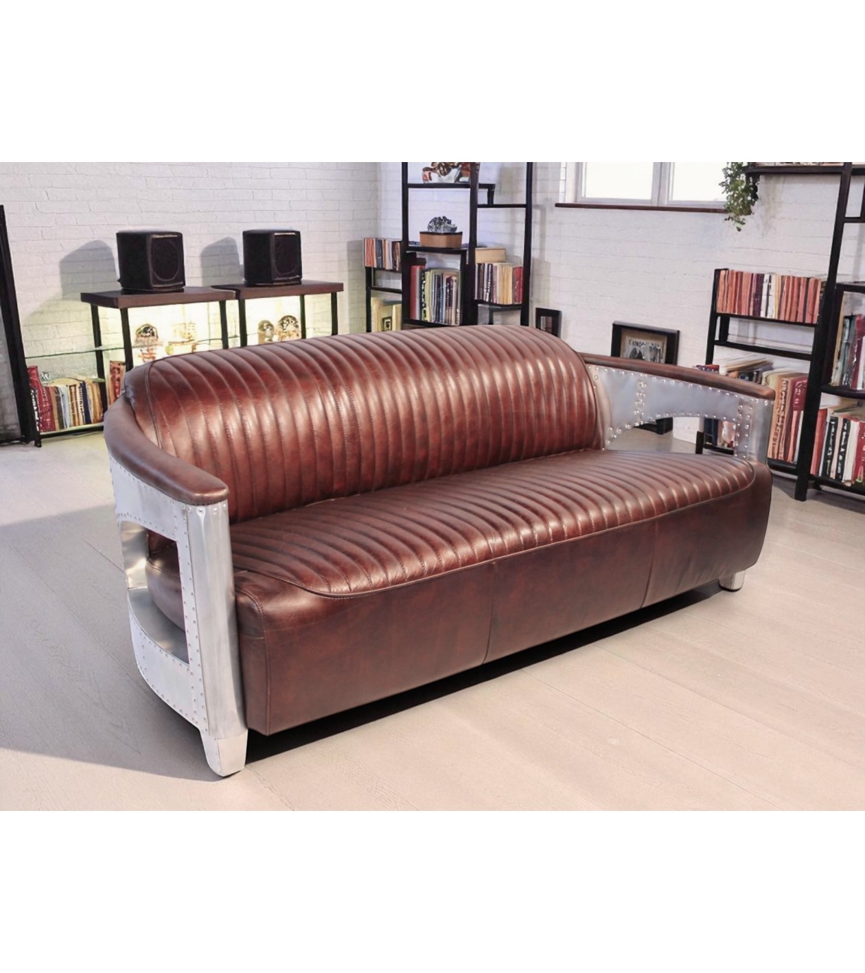 3-Sitzer Sofa im Aviator Stil aus gealtertem braunem Leder und genietetem Aluminium "Byrd"