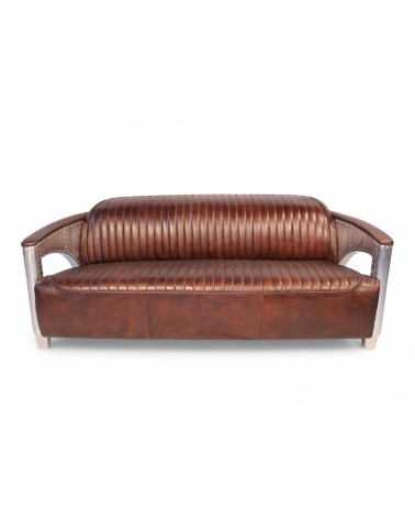 Das dreisitzige Fliegersofa "Byrd" in braunem Leder ist eine Hommage an das ikonische Design der 40er Jahre, inspiriert von der Welt der Luftfahrt. Es kombiniert den Charme von gealtertem Leder mit der Robustheit von genietetem Aluminium und schafft so Möbel mit einzigartigem Charakter. Mit seinen einhüllenden Linien und edlen Materialien ist dieses Sofa sowohl als Mittelpunkt Ihrer Einrichtung als auch als Einladung zum Komfort konzipiert.